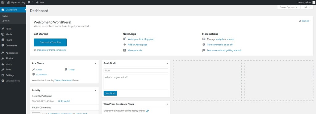 I refreshed the page and it now worked. The first thing I noticed was that the “Hello world!” post was made by a user named “admin”.