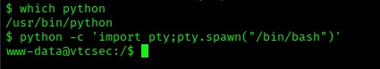From here, I decided to look and see if python was on the machine to get a more stable shell. I used which python and python was on the system. I then used python -c 'import pty;pty.spawn("/bin/bash")'.