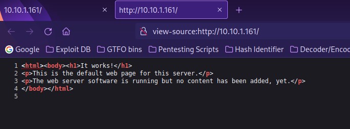 The first thing I always like to do when I notice http (80) as a port is open a browser and go to the website. On this page, there was not much at all. I looked at the page source to make sure that I did not miss anything (there was nothing there either).