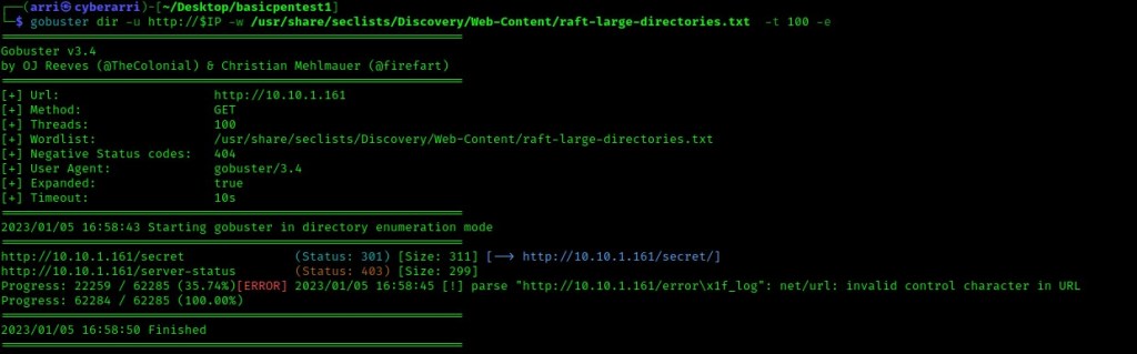 I tried going to a “/robots.txt” (since it is common for websites to have one), but one did not exist. From here I decided to try to enumerate for possible directories on the website. I used the command gobuster dir -u http://$IP -w /usr/share/seclists/Discovery/Web-Content/raft-large-directories.txt -t 100 -e.