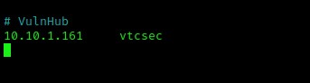 I decided to add the IP and the “/etc/hosts” file using sudo nano /etc/hosts. I then added the line “10.10.1.161(tab)vtcsec”. Note, replace the IP with your box’s IP and then change “(tab)” to be a tab. The entry I made can be seen below.