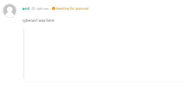 I then posted my comment. It noted that it was awaiting approval and seemed to have something underneath the comment portion. When I hovered over it, it revealed that it was actually my reverse shell that I had just uploaded.