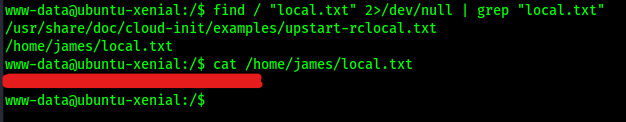 Now that I had the shell I wanted, I looked for the “local.txt” flag using find / "local.txt" 2>/dev/null | grep "local.txt" which showed that it was in /home/james/. This command looks for “local.txt” starting at root, sends all errors (STDERR or code 2) to /dev/null (basically the a black hole), and greps to ensure that only the entries that match “local.txt” exactly show up in the output.