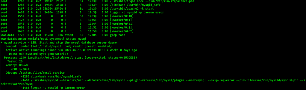 I proceeded to check other privilege escalation vectors that might be useful like SUIDs, SGIDs, capability, tmp directories, opt (which had something in it, but I could not decipher what it was), and a few other areas. I also checked for processes running as root using ps aux | grep root and noticed that there was a logging service running my mysql so I proceeded to check if the mysql service was running with systemctl status mysql and saw that it was running.