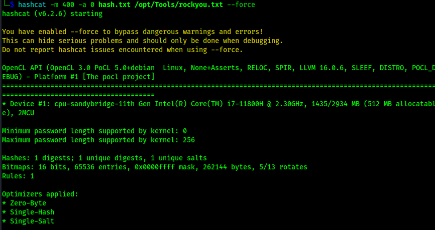When I tried to search hashcat for a MD5 that was used for WordPress, nothing showed up. After some research, I found that people use the mode “400 for this type of hash. I copied the hash into a file named hash.txt and then started trying to crack the password using hashcat -m 400 -a 0 hash.txt /opt/Tools/rockyou.txt --force. At this point, the wpscan I was doing trying to crack the password was no longer really relevant, so I stopped that password attack.