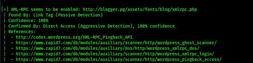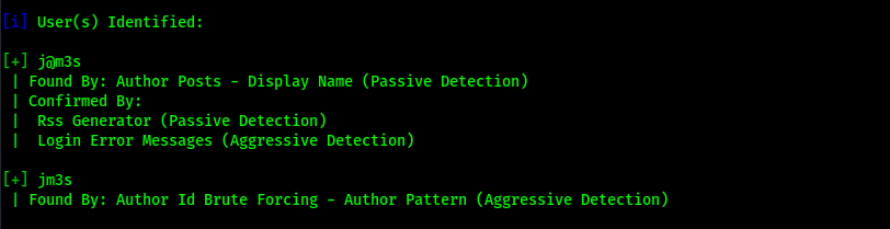 The scan returned two users “j@m3s” and “jm3s” and it also returned that there is XML-RPC enabled on the website.