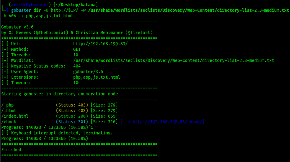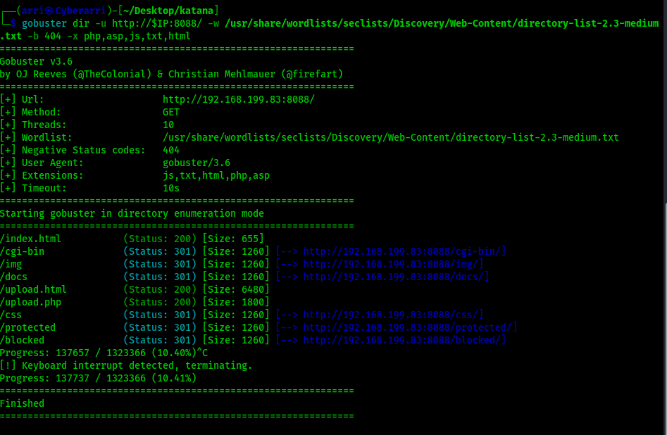 My next step was to gobuster the various webpages. The first one was to gobuster the website on port 80 using gobuster dir -u http://$IP/ -w /usr/share/wordlists/seclists/Discovery/Web-Content/directory-list-2.3-medium.txt -b 404 -x php,asp,js,txt,html which specified to ignore error codes that were 404s (-b 404) and to include the extensions php, asp, js, txt, and html to the searches. The results are shown below.