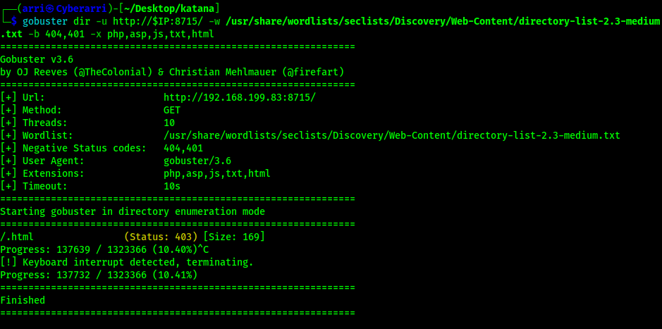 The third scan was for port 8715 using gobuster dir -u http://$IP:8715/ -w /usr/share/wordlists/seclists/Discovery/Web-Content/directory-list-2.3-medium.txt -b 404,401 -x php,asp,js,txt,html which specified to ignore error codes that were 404s and 401s (-b 404,401) and to include the extensions php, asp, js, txt, and html to the searches. In order for the scan to run, I needed to not include anything with a 401 status code. The results are shown below.