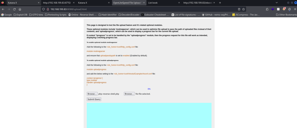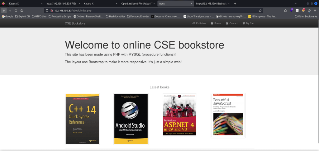 Reviewing the output of the three scans reveals some interesting information. First, on port 80 there is a “/ebook/” that can be visited. On port 8088, there seems to be an “upload.html” and “upload.php” along with a couple directories that might be able to be looked into. However, there was nothing of interest on port 8715. I first went to the website on port 80 to see what “/ebook/” was.