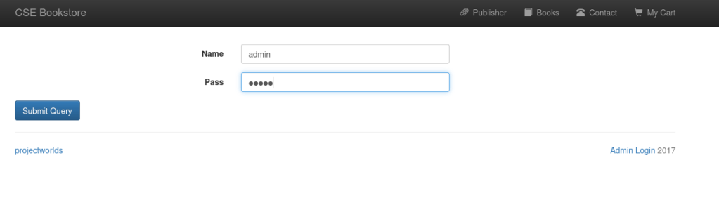 This showed that it was a CSE Bookstore. From previous experiences, I knew that this might be vulnerable. At the bottom of the page, there was a section called “Admin Login” that linked to the login page. I decided to try default credentials again (admin:admin) just to see if they would work, and they did.