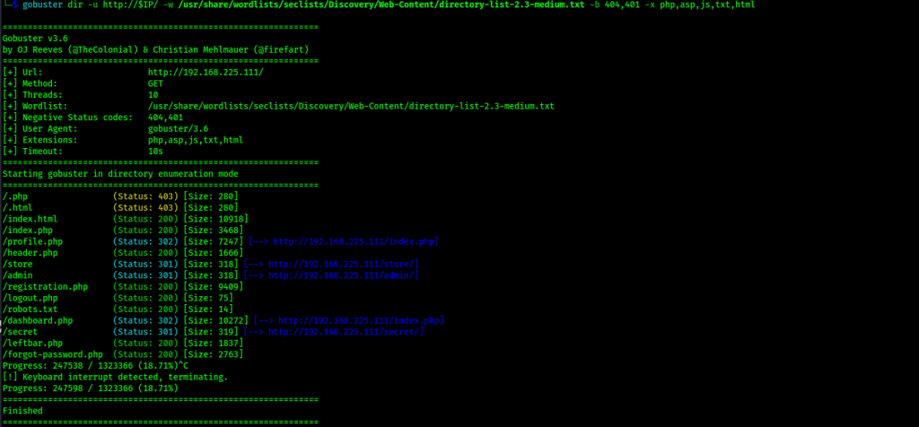 I went to the “/gym” portion of the website, and it showed up with a webpage. I then ran gobuster on both “/gym” and the normal webpage using gobuster dir -u http://$IP/ -w /usr/share/wordlists/seclists/Discovery/Web-Content/directory-list-2.3-medium.txt -b 404,401 -x php,asp,js,txt,html and gobuster dir -u http://$IP/gym/ -w /usr/share/wordlists/seclists/Discovery/Web-Content/directory-list-2.3-medium.txt -b 404,401 -x php,asp,js,txt,html. A few items showed up on the normal website.