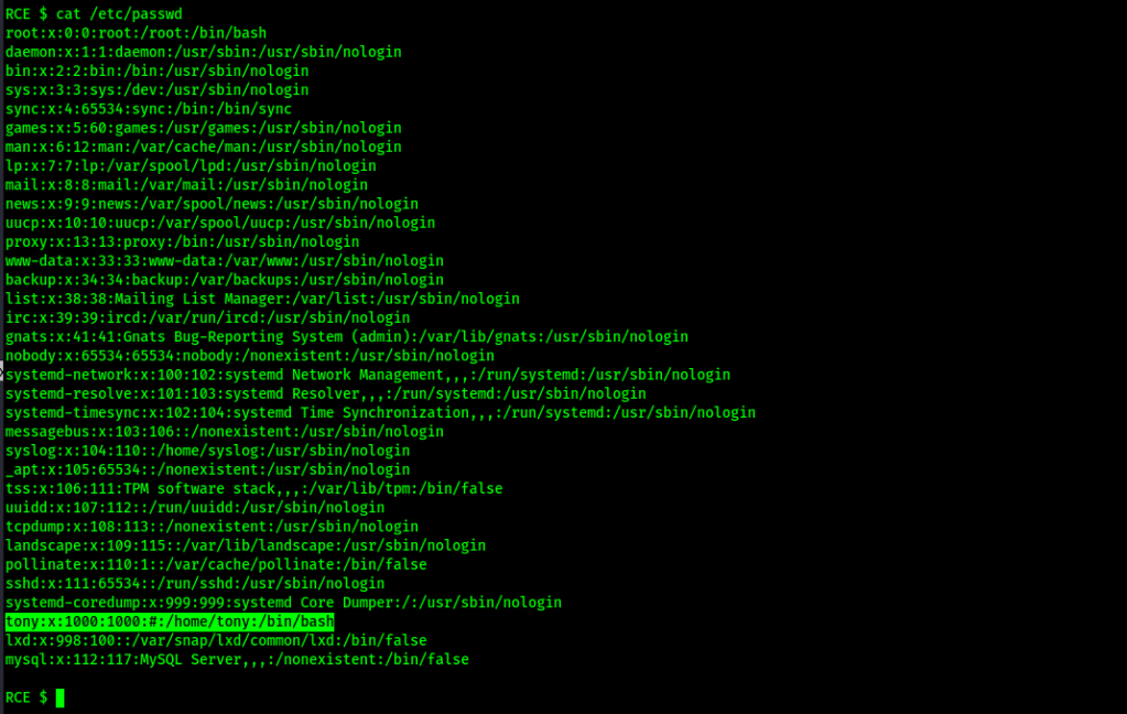 Now that I had code execution on the target, I tried to make my shell more stable, but had no luck. Continuing on, I looked for ways that I could gain some sort of credentials to get a better shell or perform actions to escalate privileges. I first looked at /etc/passwd (cat /etc/passwd) and noticed that there was a user named “tony” (users have a UID of 1000 or greater).