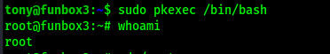 To gain a root shell, I used sudo pkexec /bin/bash. I verified that I was root using whoami.