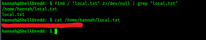 My first step was to get the local.txt flag, so to find it I used the command find / "local.txt" 2>/dev/null | grep "local.txt", which looks for “local.txt” starting at root, sends all errors (STDERR or code 2) to /dev/null (basically the a black hole), and greps to ensure that only the entries that match “local.txt” exactly show up in the output. This found that the local.txt file was in the current directory (“/home/hannah/local.txt”).