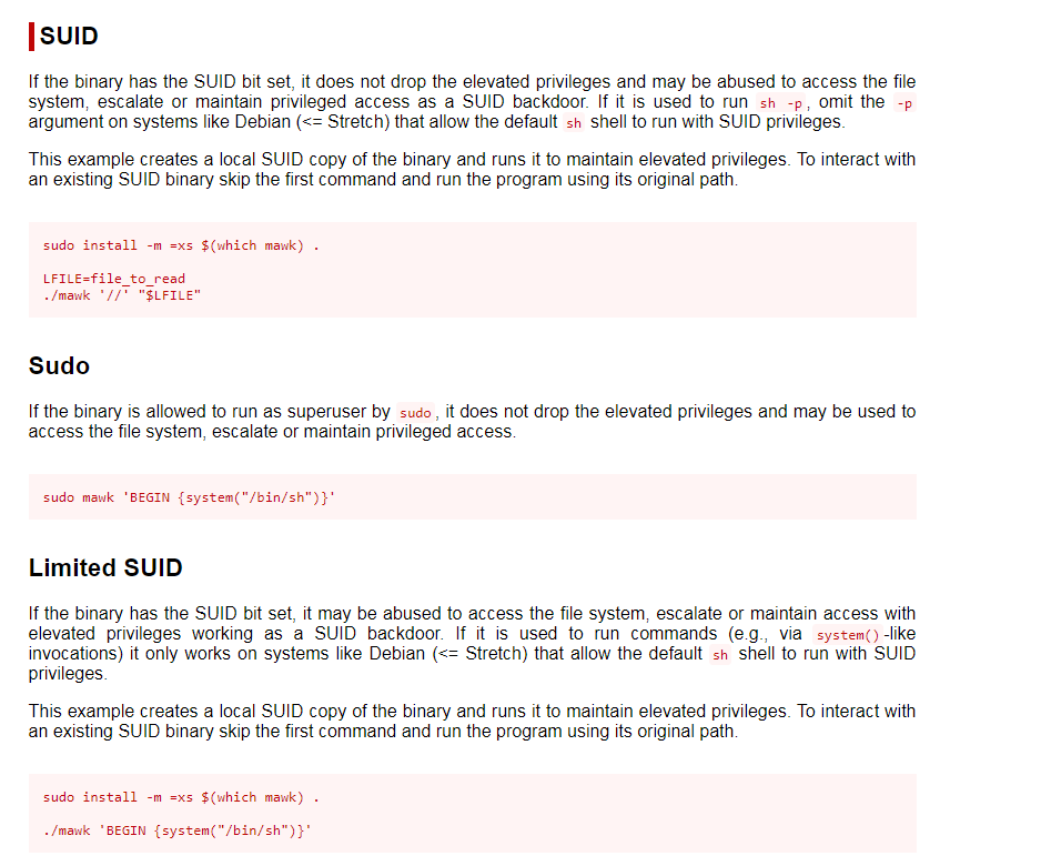 I checked SUIDs next using find / -perm -u=s -type f 2>/dev/null and noticed that there were a few strange SUIDs mentioned, one of them being “/usr/bin/mawk”.