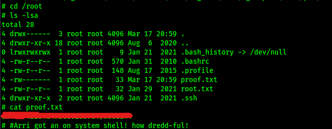 Since I was now root, I could get the “proof.txt” flag, which was located at /root.