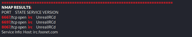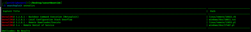 The only ports open were UnrealIRCd related ones (ports 6667,6697, and 8067). From here, I proceeded to searchsploit UnrealIRCd to see what showed up, but there was not much.