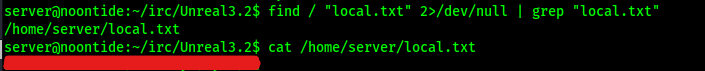 Now that I had this done, I could locate the “local.txt” file using find / "local.txt" 2>/dev/null | grep "local.txt". This revealed that the file was in “/home/server”.