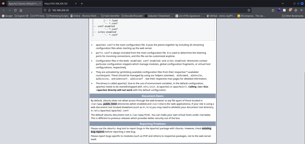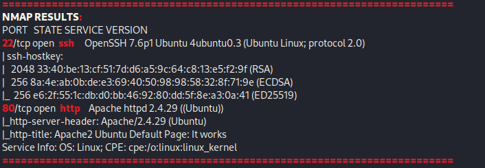 The ports that were open on the vulnerable machine were 21 (ftp), 22 (ssh), and 80 (http). Before I did anything else, I went to the website. The webpage does not have anything interesting and seemed to be a default Apache webpage with nothing of interest in the source code.
