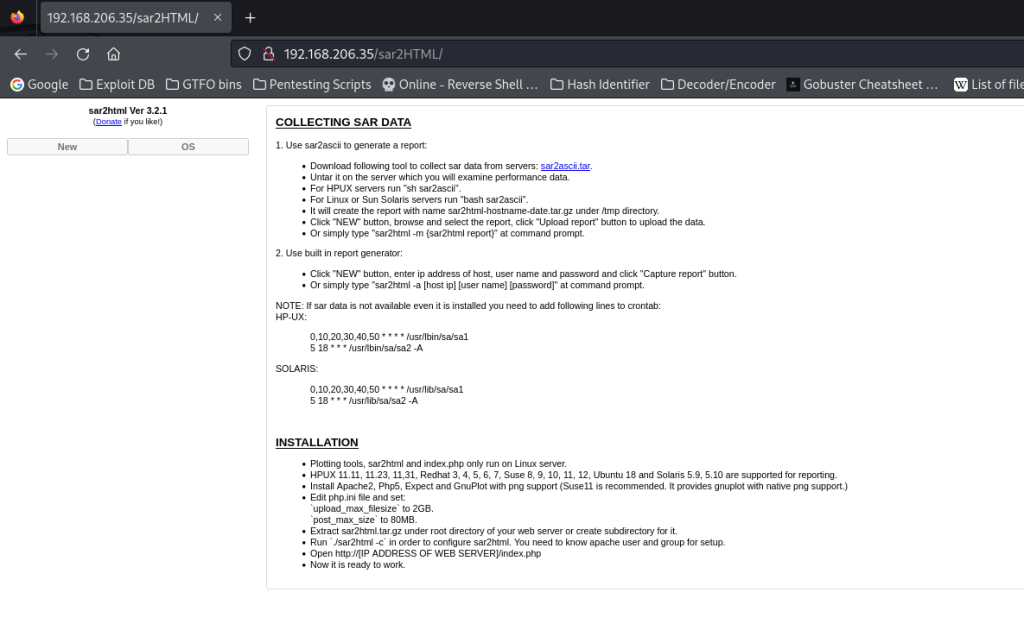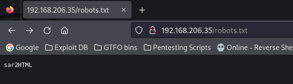 I started a gobuster scan using gobuster dir -u http://$IP/ -w /usr/share/wordlists/seclists/Discovery/Web-Content/directory-list-2.3-medium.txt -b 404,401 -x php,asp,js,txt,html which specified to ignore error codes that were 404s or 401s (-b 404,401) and to include the extensions php, asp, js, txt, and html to the searches (-x php,asp,js,txt,html). This reveals a “.php”, which means that the website uses PHP technology. Also in the output, “/robots.txt” showed up. I decided to visit this webpage. The “/robots.txt” file mentioned another directory named “sar2HTML”.