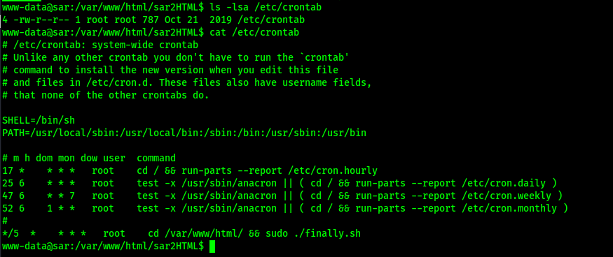 The output above showed that there was a script (“finally.sh”) being run every 5 minutes out of the /var/www/html directory. I checked to see if it was editable using ls -lsa /var/www/html/finally.sh, but it was not.
