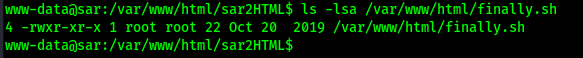 My next step was to see if it referenced anything in the script that would be editable by my current user. I did this by viewing the contents of the file (cat /var/www/html/finally.sh).