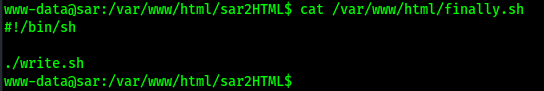 The output from the file above shows that it runs a file named “write.sh” that should be in the same directory as the “finally.sh”. I checked the permissions on this new file using the command ls -lsa /var/www/html/write.sh and it was editable.