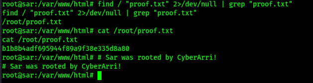 I then located the final flag using find / "proof.txt" 2>/dev/null | grep "proof.txt" and read the file using cat /root/proof.txt.