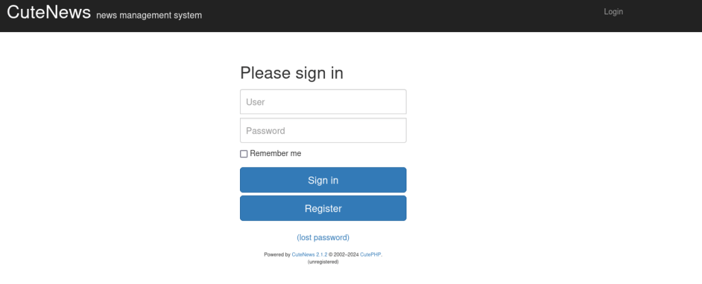The website on “/index.php” reveals a login page. This login page reveals that the website is running the CMS CuteNews, version 2.1.2.