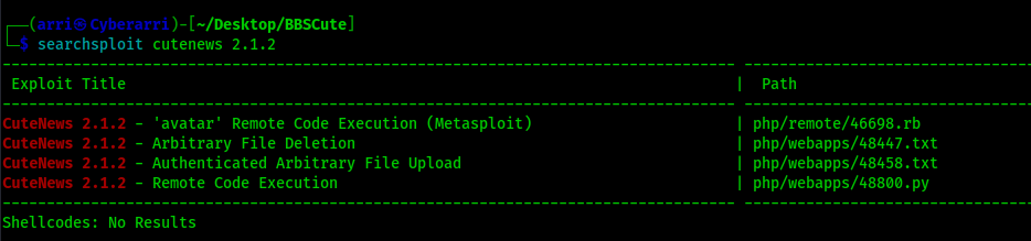 Seeing this version, I decided to use searchsploit cutenews 2.1.2 to see if there was any vulnerabilities for this specific version of the CMS. Running this command brought up a few different possible vulnerabilities.