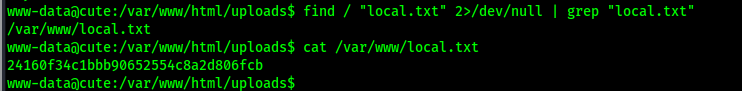 To find the first flag, I used the command find / "local.txt" 2>/dev/null | grep "local.txt". This showed that it was in /var/www/. I then viewed this and submitted it as my first flag for the machine.