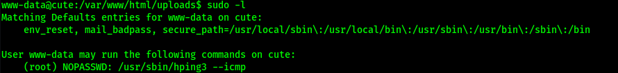 When I tried, the hping3 vulnerability for the sudo -l permission was not working the way that GTFObins described. I could have spent too much time on this and got stuck. By continuing on and trying to see if there was another way I could get into the machine before I came back to that vulnerability I allowed myself to find a better way to get in that worked out perfectly for me.