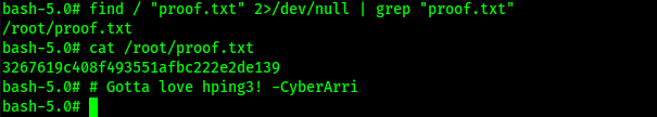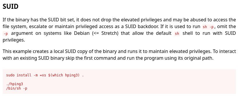 I proceeded to search for SUIDs using the command find / -perm -u=s -type f 2>/dev/null and found that there was also a SUID for hping3 as well. I went back to GTFObins and looked at the SUID for hping3 (https://gtfobins.github.io/gtfobins/hping3/#suid) to see how I could run the exploit.